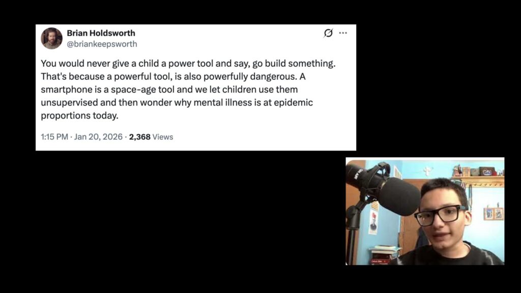 Brian says that phones are “space-age” technology. Saying that the unsupervised use of technology has led to the mental health epidemic of today.